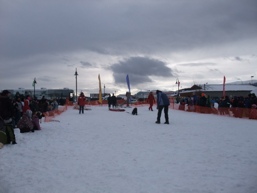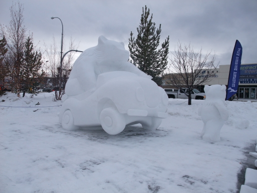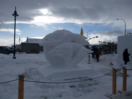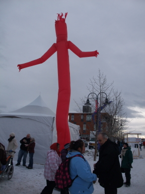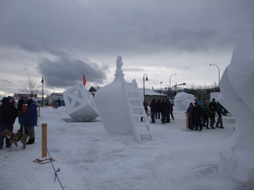 会場では、氷の彫刻の展示やミニ犬ぞり競争、力持ち競争、ライブなどが行われ、屋台も出て賑やかである。また、ホテルに戻る途中、メインストリートでは若い女性(ボランティア)がハグして呉れたりしてフレンドリーさを演出したりしている。