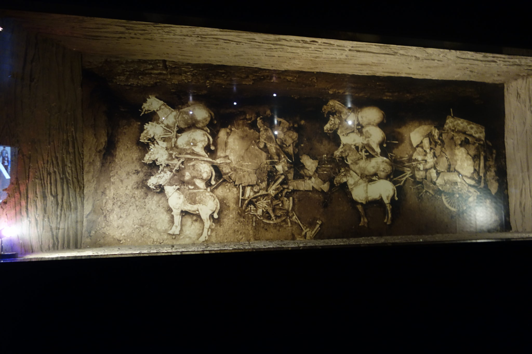 展示室に入って最初に目にしたのが発掘された当時の銅車馬の写真、馬は比較的よく形を残しているが車の部分はつぶれて粉々になっている。