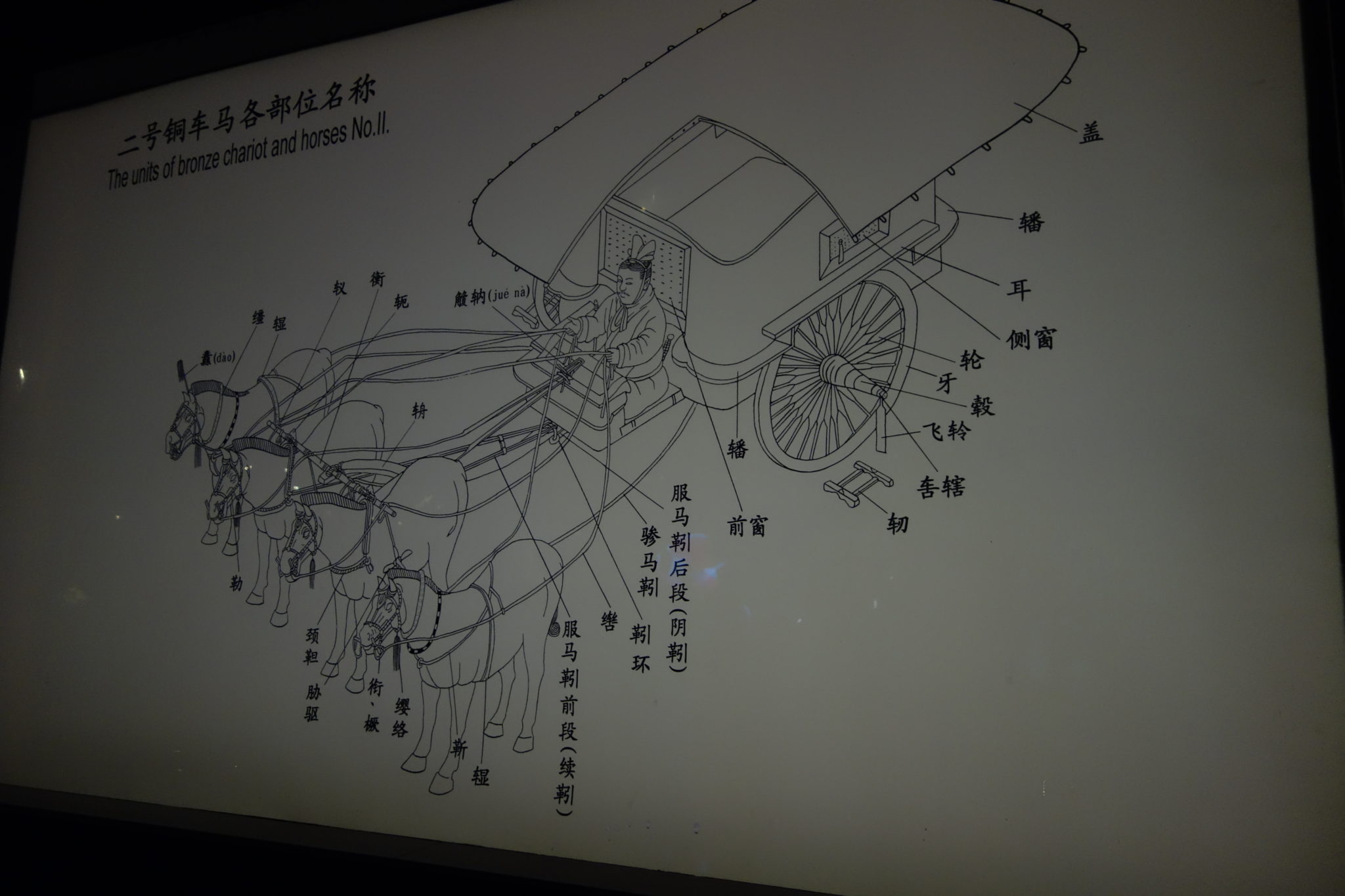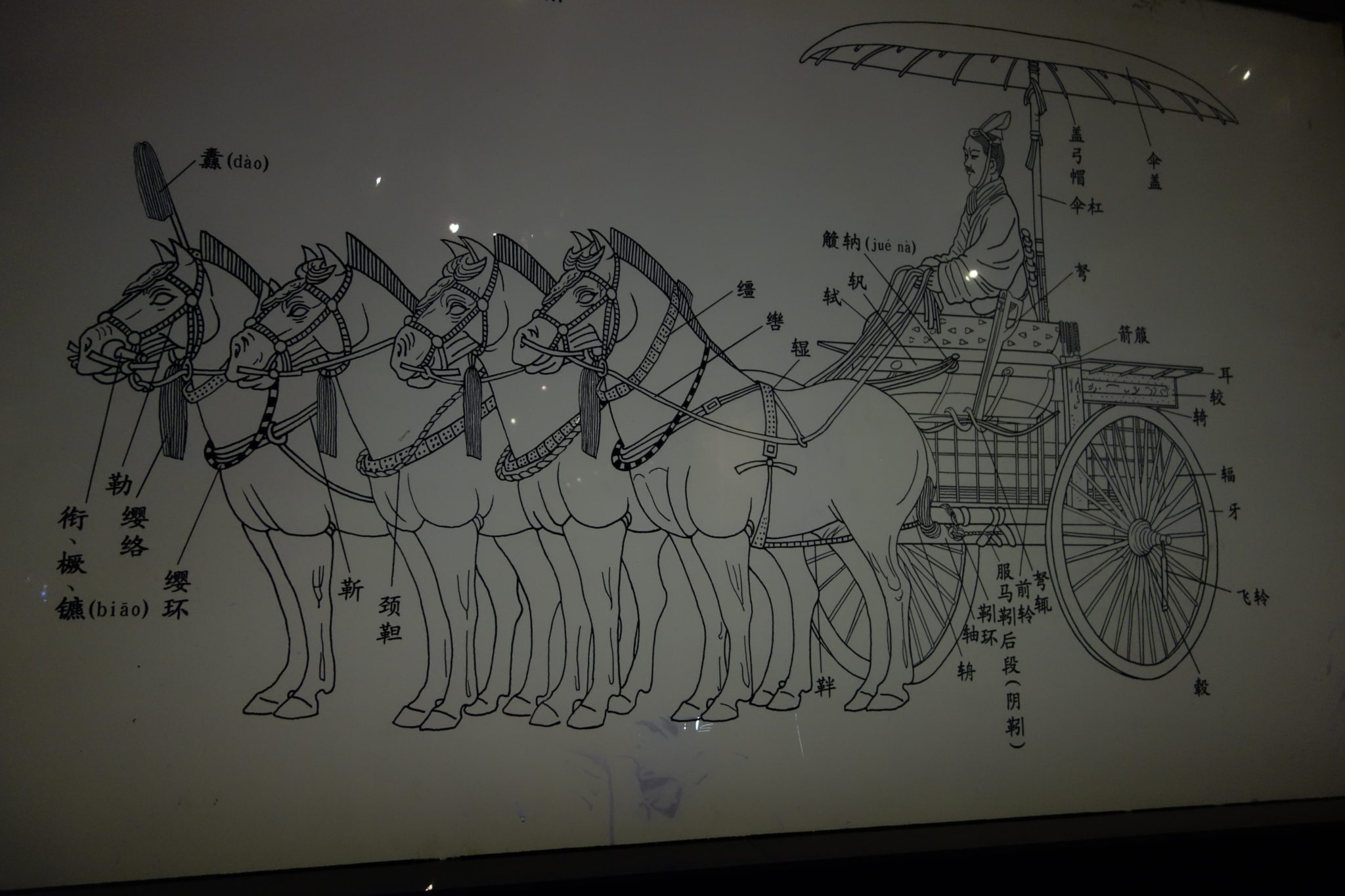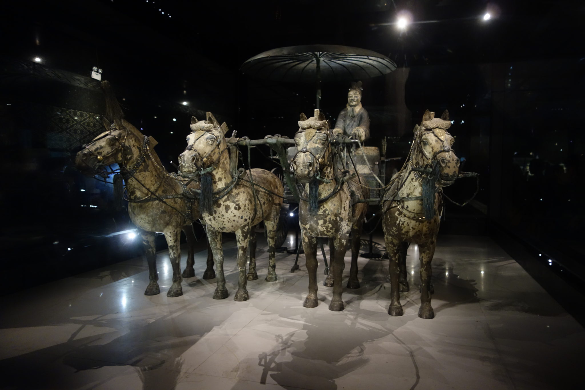 兵馬俑2号坑の通路に展示されている騎馬俑の逞しさの表現に感激したが、この銅馬はどっしりとして、しかも優雅である。さらに、御者台に立つ御者、長い柄の傘など、素人目にも芸術性の高さが分かって驚かされ、2200年も前の青銅の鋳造作品だと思うと嬉しくなる。