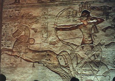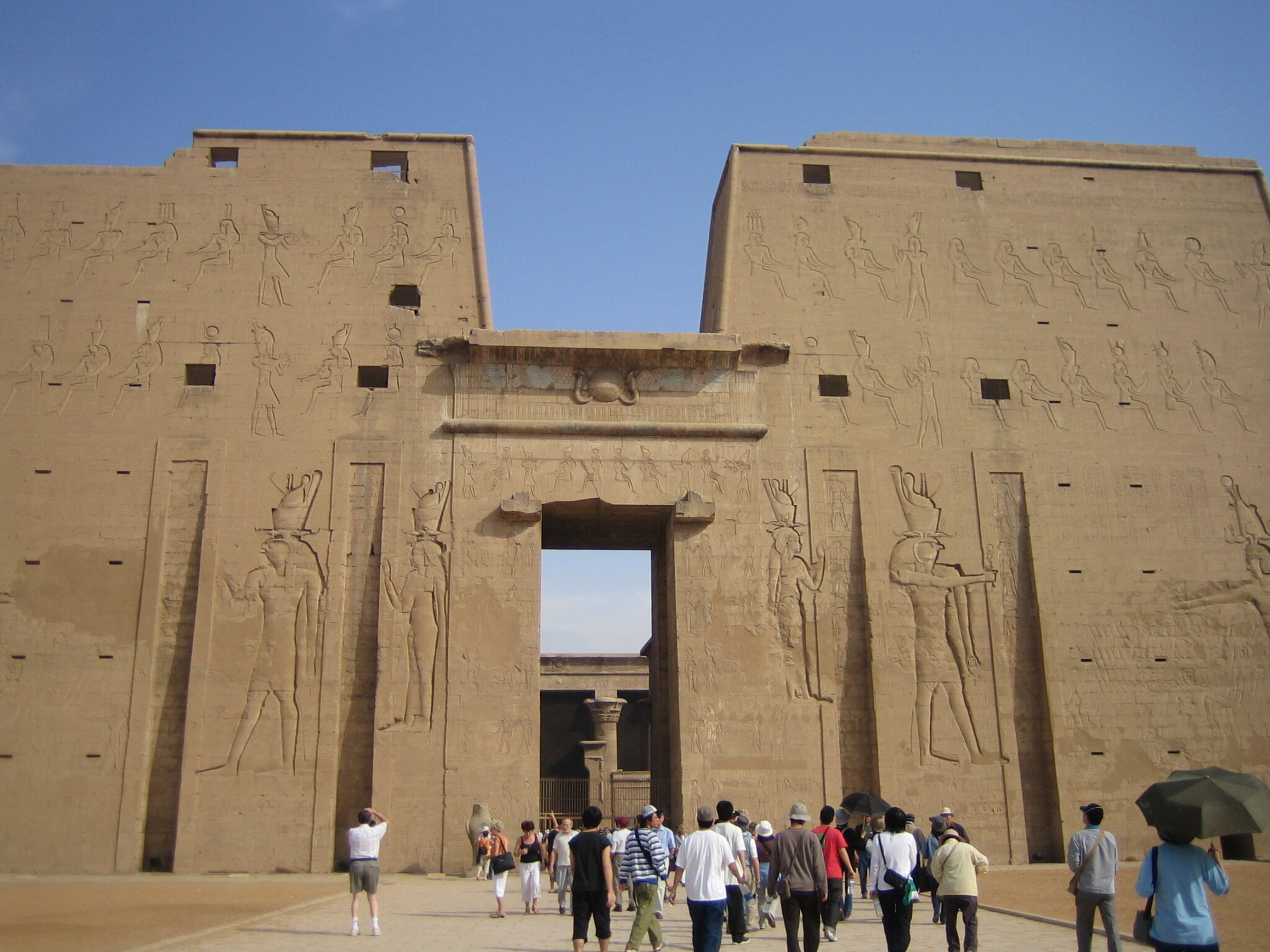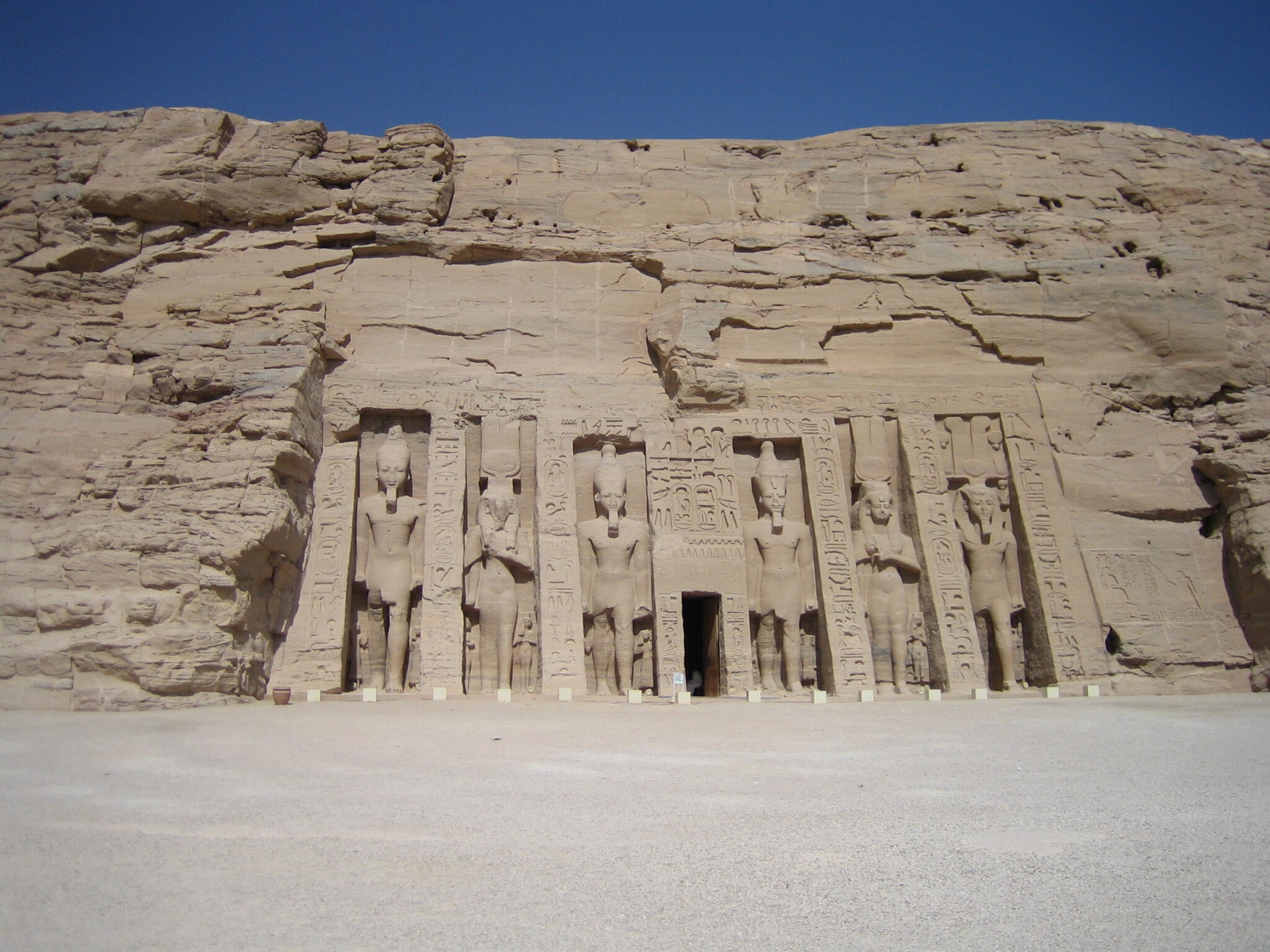 岩山をぐるっと回って大神殿の正面にでると、ラムセス2世の坐像が神殿の入口を挟んで2体づつ4体並んでいる。おうっ・・、これは何だと言う感じで、エジプトに入って3日目、大きいものにも慣れてきている筈だが、この22mをこえる巨大な像には圧倒される。