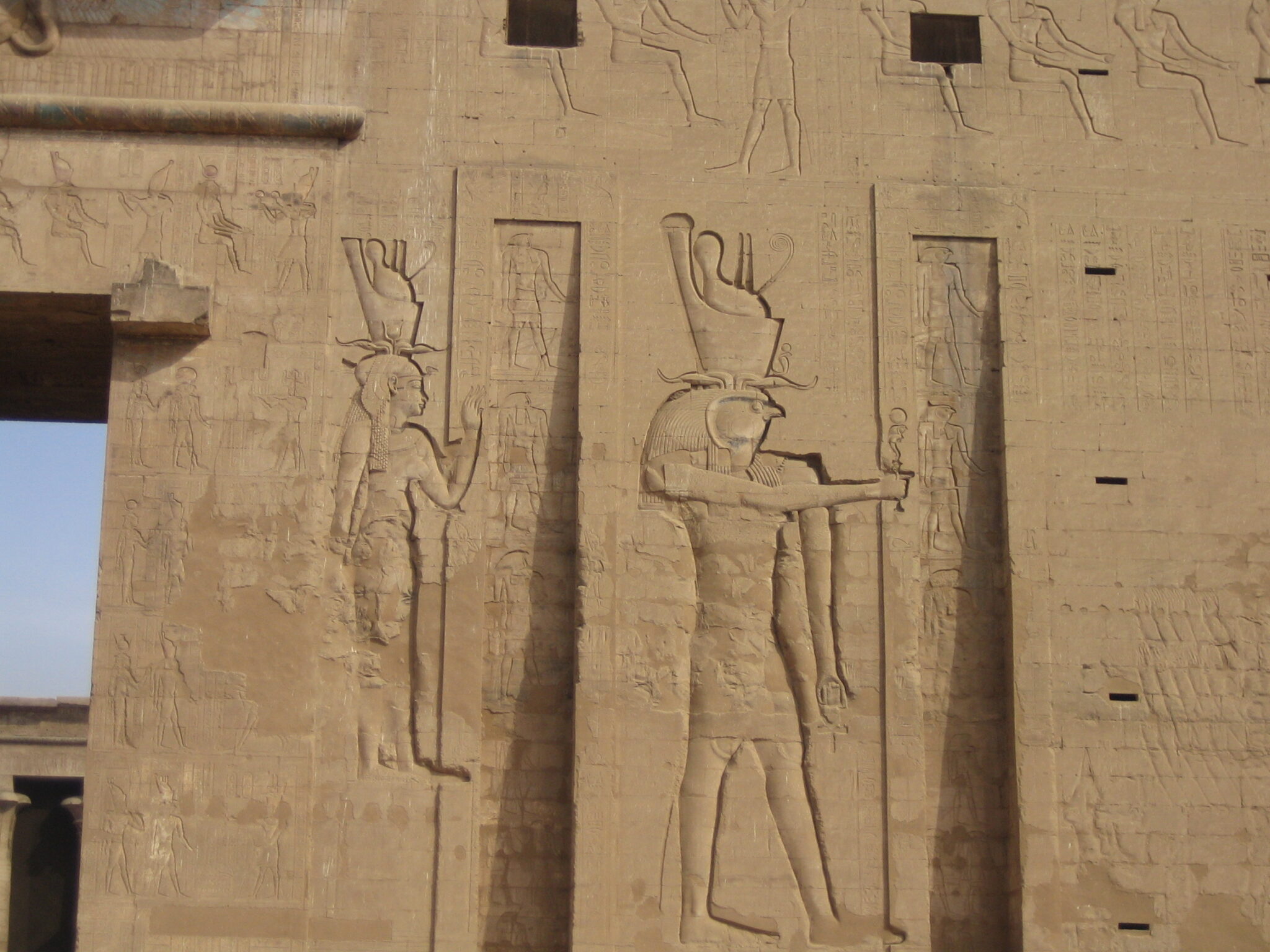 第1列柱室の前には二重王冠を被ぶりハヤブサの姿をしたホルス神像が佇んでいて写真撮影のスポットとなっている。