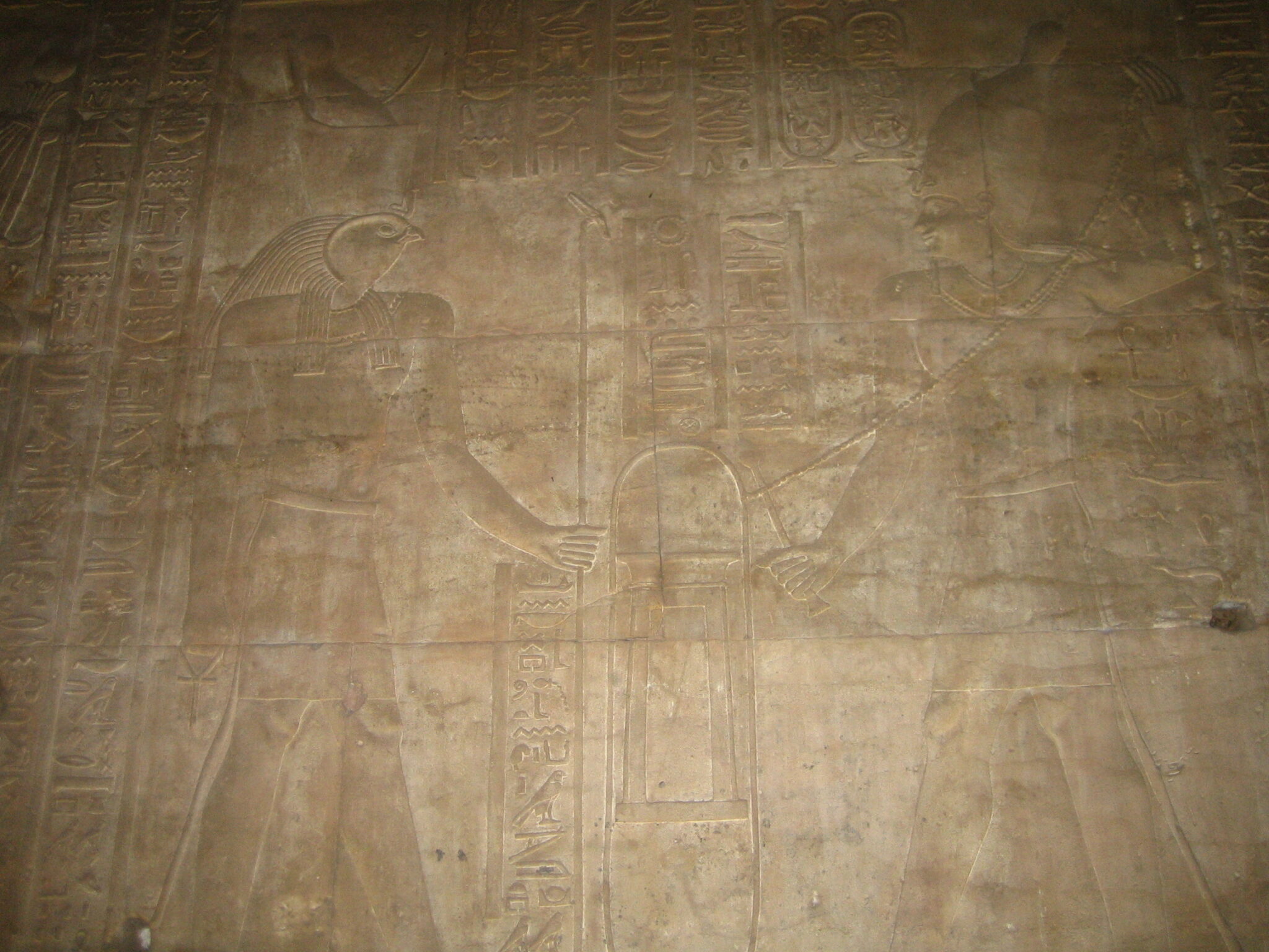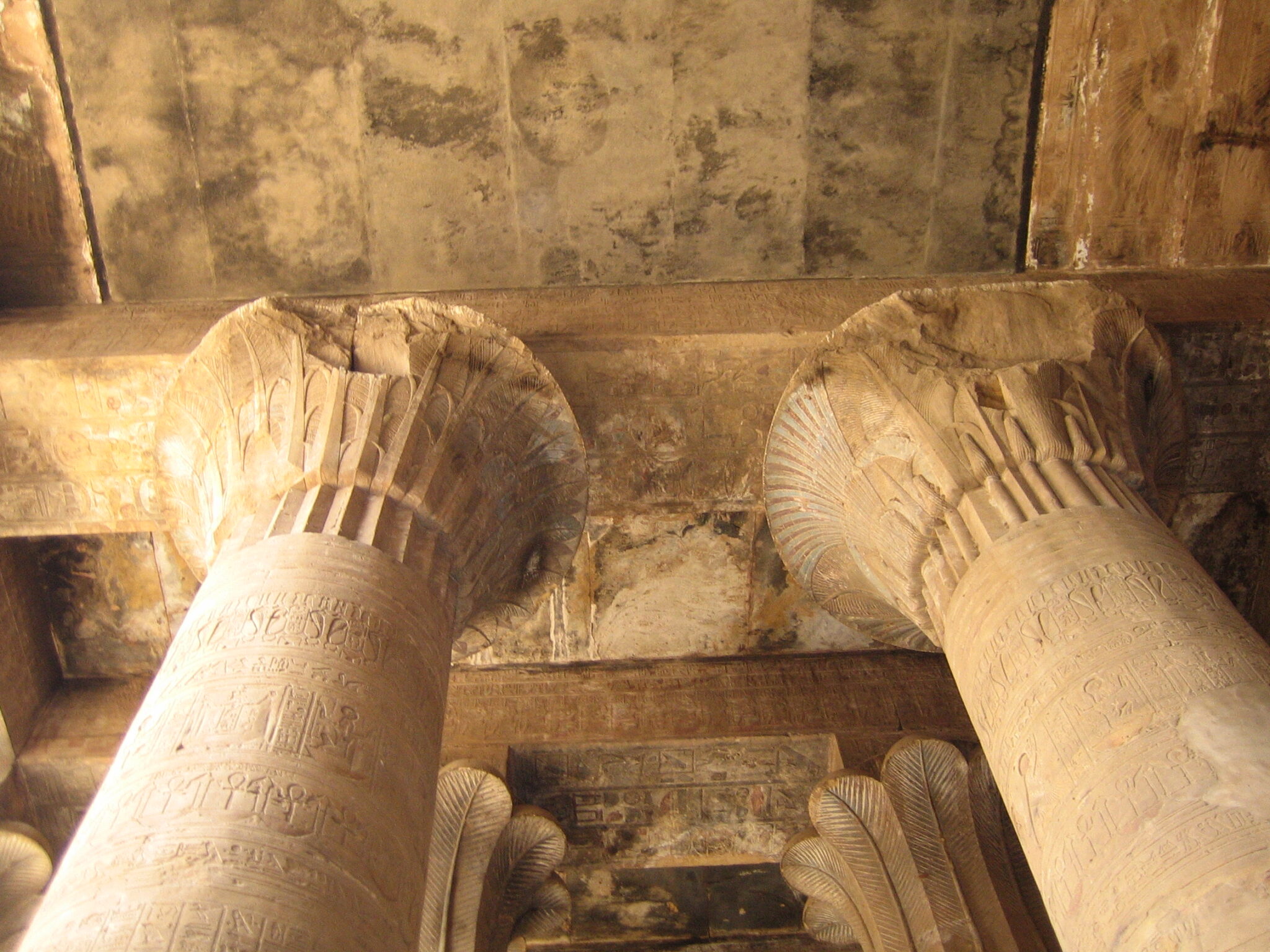 第1列柱室に入ると、柱にはコリント様式の装飾がされている、この列柱室には天井も残っていてエジプトの神殿のなかでは最も保存状態がよい神殿とされている。