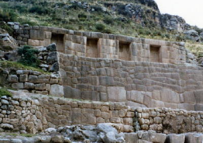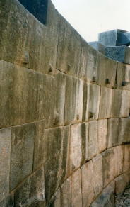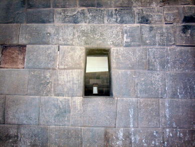 神殿の横の壁の石組み壁はすこしふくらんでいる感じだが、正面の壁は1枚石のように精緻に仕上げられ、インカの石工の真髄をみせられた感じだ。