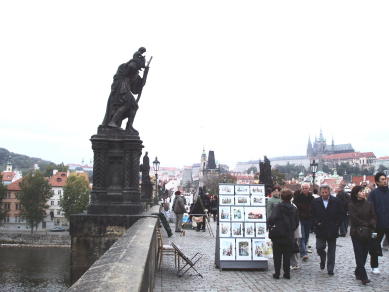 15分でカレル橋に着く、カレル橋はプラハ城と市街地を結ぶヴルタヴァ川に架かる橋だが、それまであった橋が流されたりしたのでカレル1世の命により新しい橋を建設したものである。