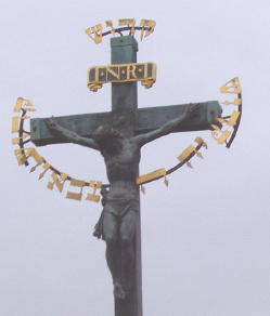 彫刻の第1号は聖ヤン・ネポムツキー像、王妃の不義の秘密を守り通して、拷問を受け殺害されてモルダウ川に投げ込まれたとか。その時、水面から5つの星が現れたと言われている。