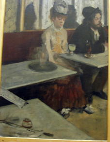 カフェにて:カフェで二人並んだ男女がお互いに無関心でそれぞれの思いにふけっている様子である。でも、よく見ると男は一筋縄ではいかないいかつい面構えをしており、女は浮かぬ顔で投げ遣りな感じである。売春宿の亭主の小言に稼ぎが無かった娼婦がふてくされているようでもある。