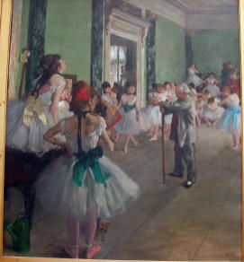ダンス教室:ドガと言えば踊り子の画家と称されるが、ドガは長年にわたってオペラ座に通い、踊り子たちのさまざまな動きや表情をつぶさに観察し続けた。「ダンス教室」は踊り子のステップを見つめる老練なダンス教師が主役で、斜め横から描かれている。彼の前面にはかれの指導を待つ踊り子たちがさまざまなポーズをしている。