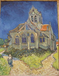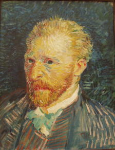自画像:ゴッホは自画像をたくさん描いているが、この淡い青色を基調とした自画像はゴッホが死亡する1年前、36才のものだが、西洋人の年令は分かりにくく50才代に見える。青色は冷たさ、寂しさを表すとも言われるが、淡い青色の衣服や背景のうねるような青い曲線はゴッホの不安な内面を反映しているかのようだ。