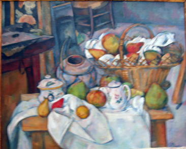 リンゴとオレンジ:リンゴとオレンジが食器に盛られた静物画。絵を見て楽しむでけの素人目には、言われなければ分からないが、真ん中のオレンジを盛った柄の付いた皿は正面から見る角度からは奥の縁が見え過ぎる気がする。