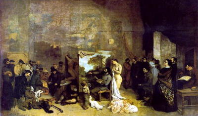 画家のアトリエ: 縦3.6m、横が6mもある大作である。’私のアトリエの内部、わが7年間の芸術的な生涯を要約する現実的寓意’という長い副題が付いている。寓意とは、信仰や死などの抽象的な事柄を具体的な物事に託して表すことで、日本の比喩に似たものと思える。