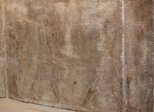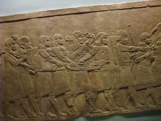 このレリーフはアッシリアの戦いの典型的な結果を表していると言われ、捕虜と戦利品の検閲の様子が描かれている。アッシリアは戦利品をすごく正確に記録したと言われているが、これは貢物が軍事遠征の重要な要素であったことを示しているのだそうだ。アッシリアの兵士が捕虜を王の処に連れてきており、幅広のヘッドバンドをしている男は何か気になることがあって引き出されているらしい。戦利品が空中に表されているのは余白の利用か?