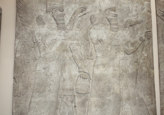 聖なる樹のそばでアッシュールナシパル2世が鷲頭の精霊の前後から祝福を受けているようである。鷲頭の精霊は左手の手桶から湧き出た聖水を右手の松ぼっくりから王に振りかけているのであろうか? 王座の間の前には鷲頭の精霊と聖樹ばかりのレリーフが飾られたところがあったと言う