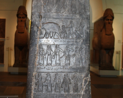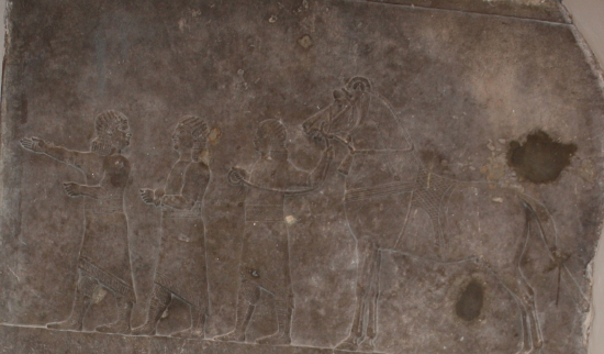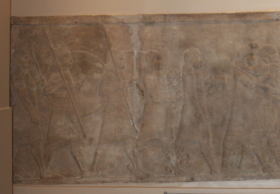 北西宮殿の王座の間の正面を飾っていた各国の朝貢団の一場面である。貢物を運ぶ2人の使者が描かれていて、1人目は北西シリアでみられるターバンのようなものを被っていて、両腕を胸の前に上げているので服従を表していると言う。2人目のフェニキア人は2匹の猿を貢物として連れている。猿はエジプトか南部アラビアのもので、フェニキアはこれらの地域と活発な貿易を行っていた。アッシリアの王達は珍しい外国の動物や植物を収集するのを好んだと言う。