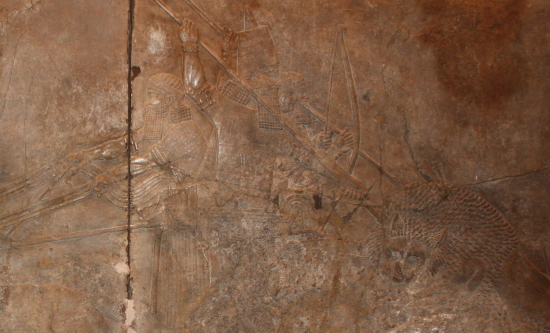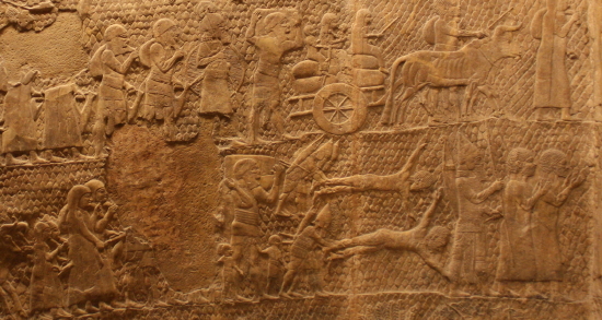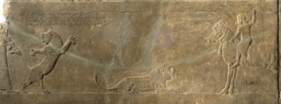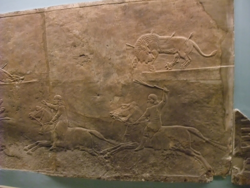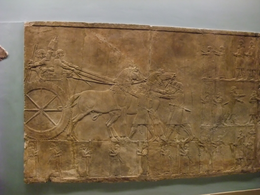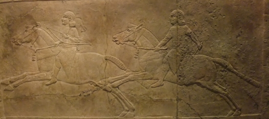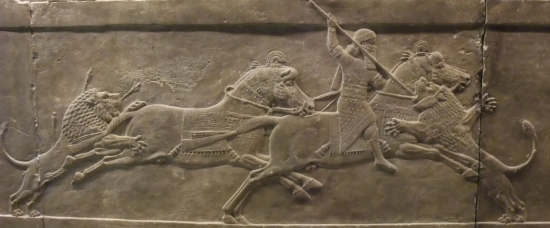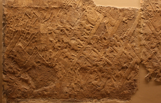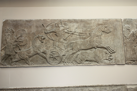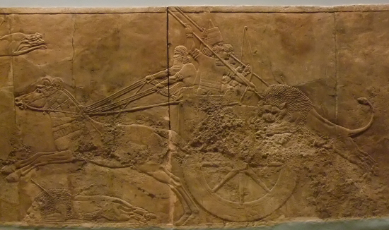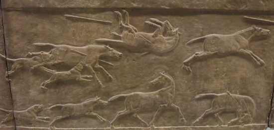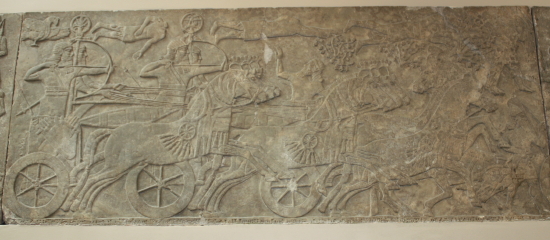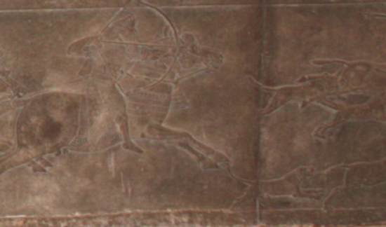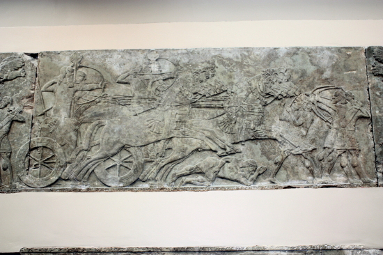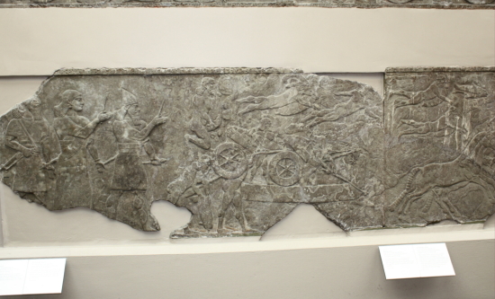 アッシリアの高官が戦車に乗って敵の騎兵を川の方に追い詰めている。討ち取られた敵を見るとターバンを被っているので北西シリアあたりのようである。