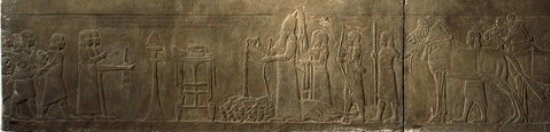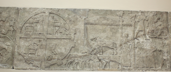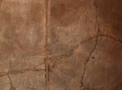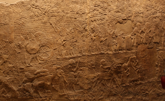 さらに、聖なる戦旗を掲げたアッシリアの戦車が敵の戦車を圧倒しながら前進しているレリーフもある。辺りはブドウ畑が広がる景色である。戦旗の1つはアダト神を表し、他はネルガルだろう言われている、アダトは雷雨と豊穣、ネルガルは地下世界の支配者らしい。