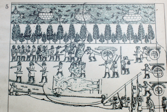 沼地の戦いで捕虜となった敵兵が家族や持ち物と一緒に椰子の森のなかをアッシリの本部に向かって行進しているところでは、敵の首をいくつも持ったアッシリア兵は褒美にブレスレットを貰っている らしい。