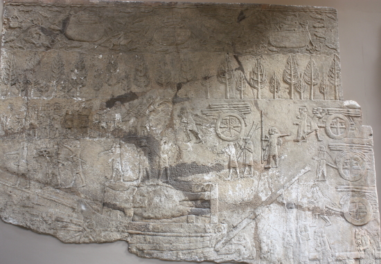 莫大な数の捕虜がソリに結び付けられたロープを引っ張っている。親方が轍の上のコロの位置を調整している。上部には川(多分、ティグリス川)が流れ、堤防には木が並んでいる。川では2隻の舟と大量の木材を組んだ筏がきしみ合っている。多分この木材は宮殿の屋根材になる。