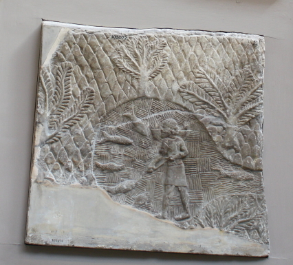 アッシュールナシパル2世の宴会の間から出土。このレリーフは特にすばらしい出来とされ、着物に施された繊細な切れ込みは刺繍のようである。アッシリアでは通常被っている冠で王と分かるようになっているが、バケツを伏したような型の帽子に巻かれた2条の頭環が背中に垂れ下がっている。王の後ろには多分宦官と思われる従者が王の武器と蝿たたきを持って立っている。
