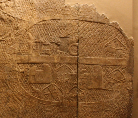 アッシリアの高官が軍の渡河(多分、ユーフラテス川)を指揮している、いく人かの兵は毛皮の浮き袋につかまっており、他のものは舟に戦車を載せようとしていて臨場感がある。