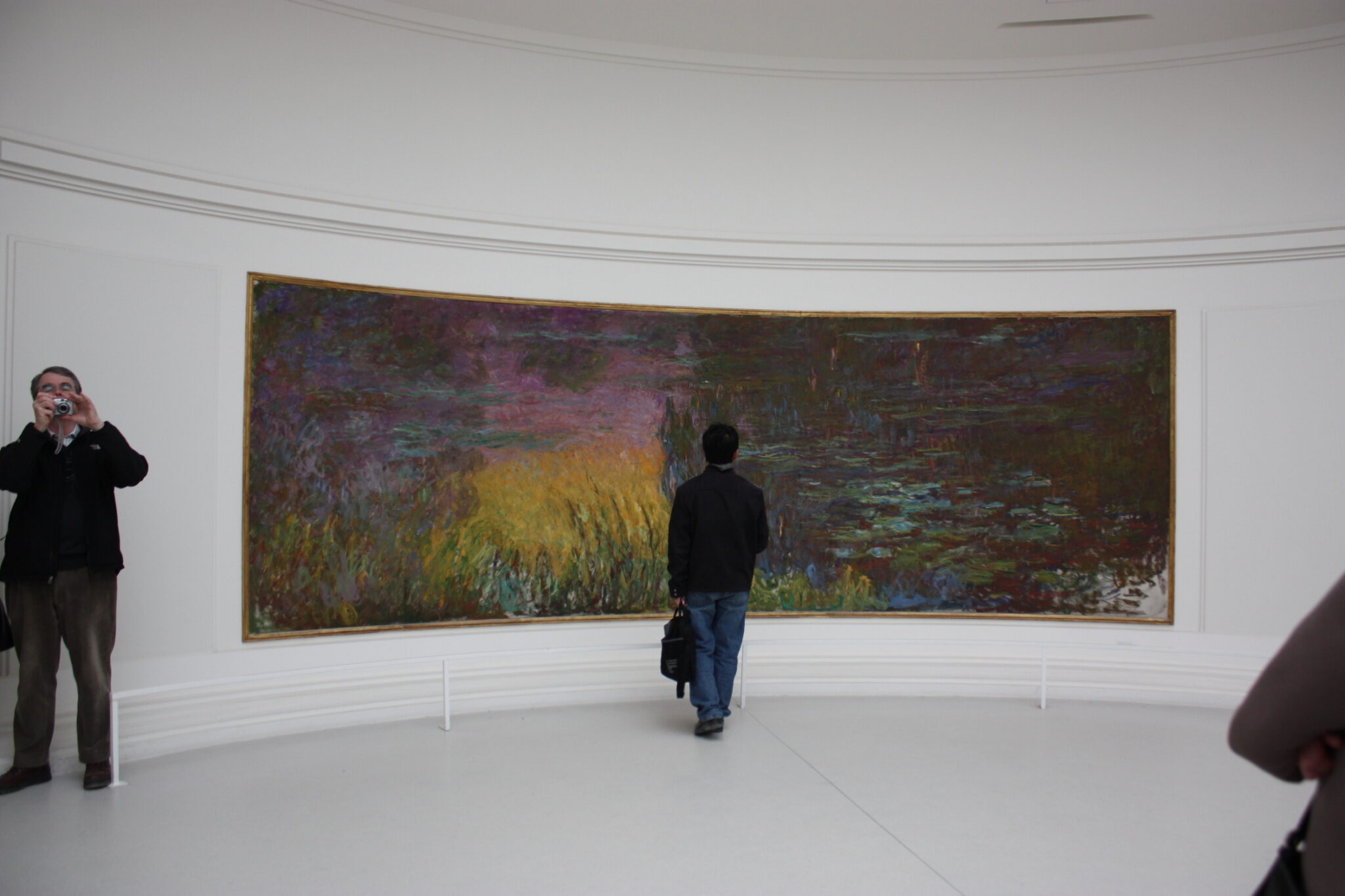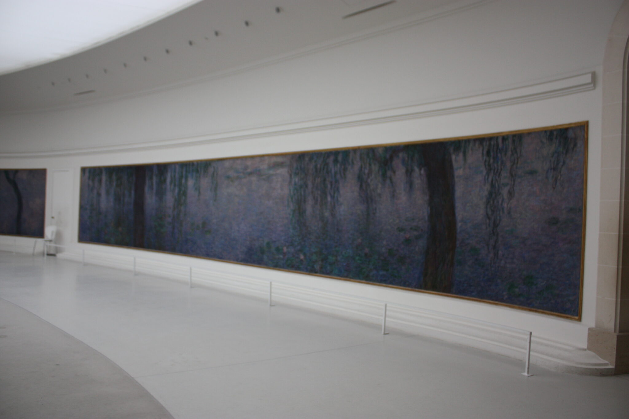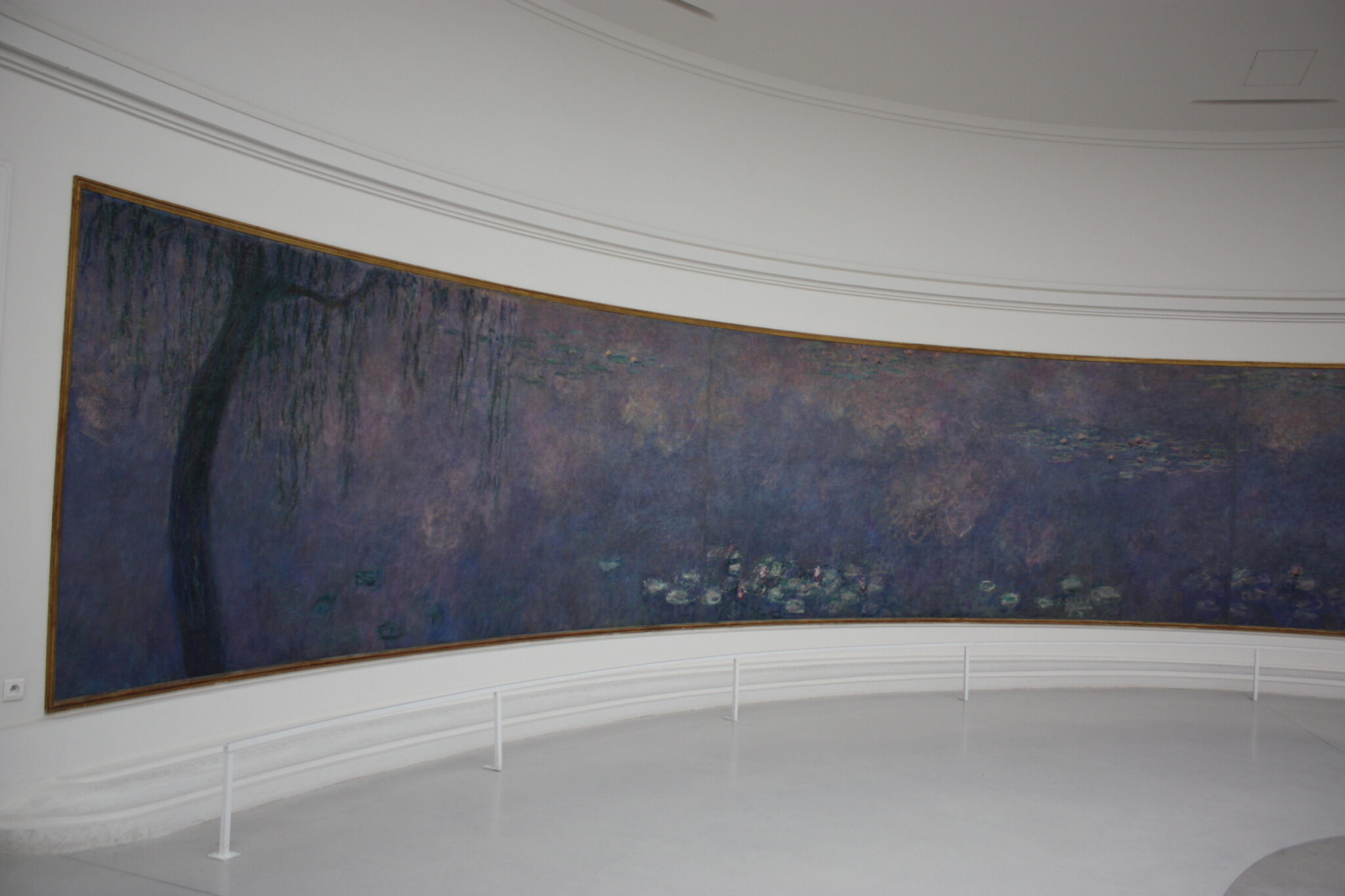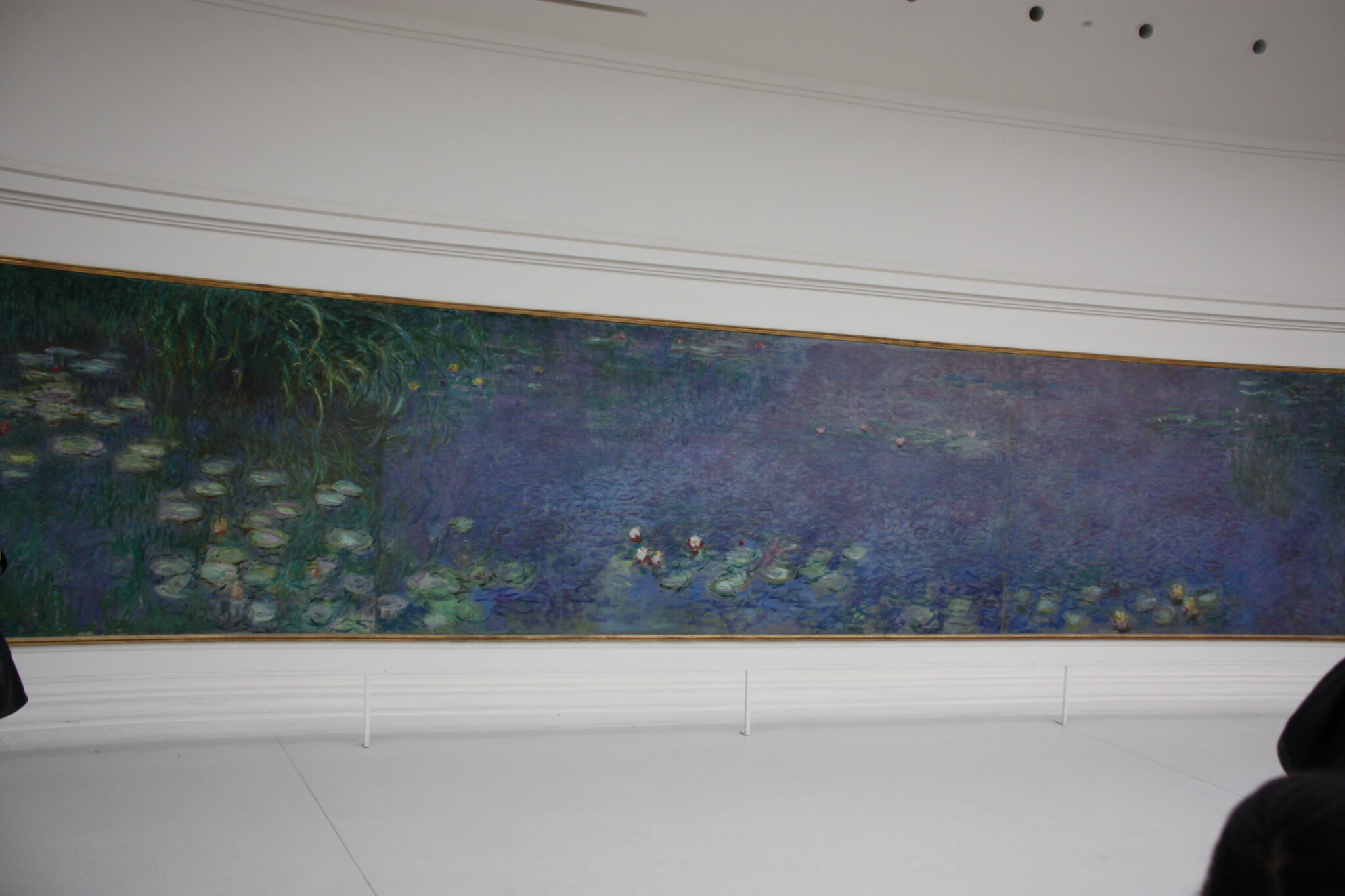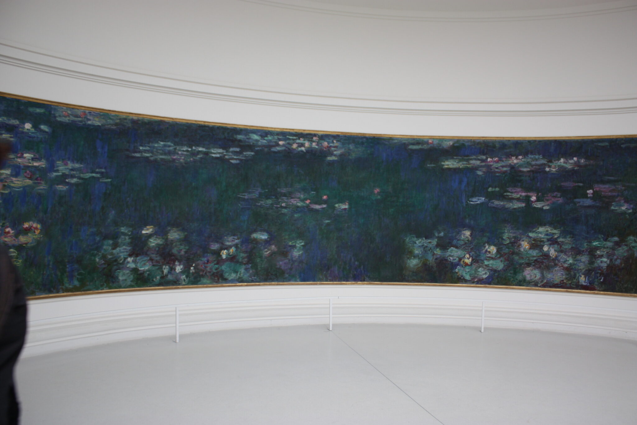 入口に続くすっきりとした通路空間を通って睡蓮の間に入ると、縦30m、横15mもあろうかと思われる楕円形の部屋の壁をぐるっと睡蓮が囲んでいる。小舟から水面に浮かぶ睡蓮や水草などを眺めているような贅沢な空間に身を置いている感じである。