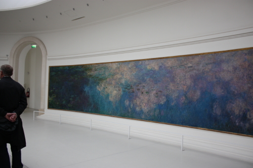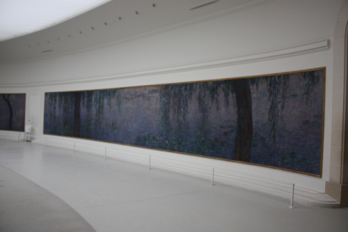 親友であったクレマンソー(強権政策で知られ、首相も務めた)の勧めで、晩年のモネは睡蓮2点を描き国に寄贈することになり、展示されるオランジュリー美術館の改装も自ら手がけていたそうだ。モネの没後、ほどなく8点からなる大作、睡蓮は楕円形の部屋2室に展示され、美術館を訪れる人々に画家の集大成であり絶筆となった睡蓮を堪能させてくれている。