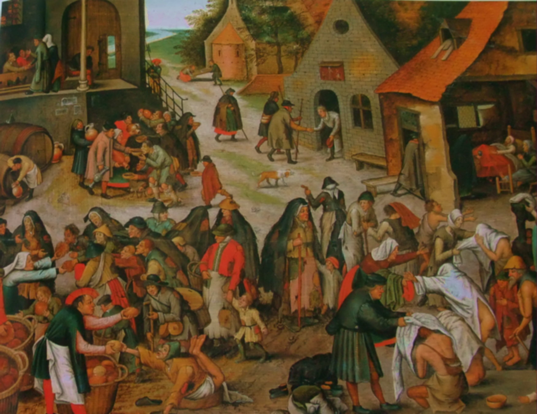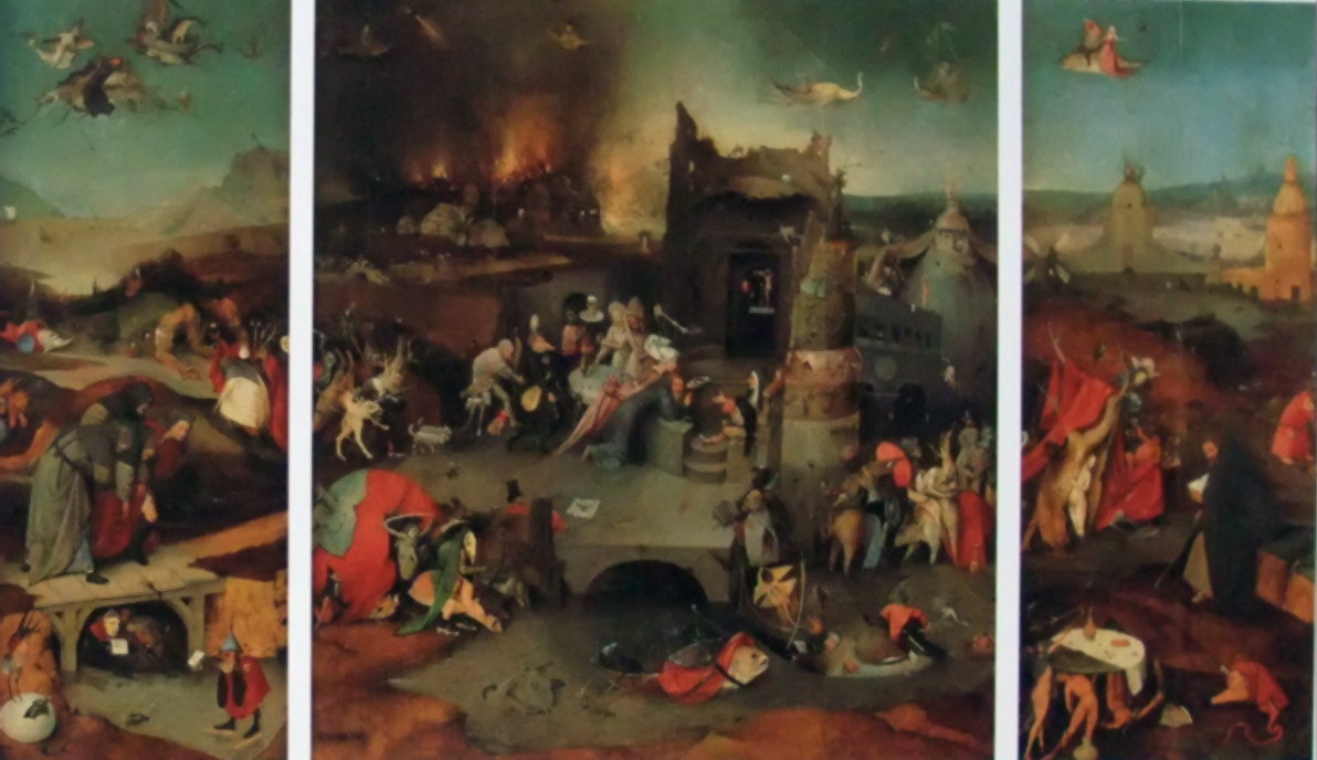 ‘聖アントニオの誘惑’は3枚パネル画で、空を飛ぶ魚、猿、象、猪、蜥蜴、狼や異形の怪獣、枯れ木に垂れ下がる赤い布の下には女のヌード、本を読んでいる不気味な男、遠くには町が燃え上がっている様子など聖アントニオを誘惑した化け物どもの饗宴が描かれている。真ん中のパネルの台に肘をついて不安そうに正面を見ている男が、髭を生やしているので聖アントニオらしい。ボッシュの絵は‘快楽の園’でもそうだが、虫眼鏡が必要なほど画面の隅々まで緻密に描かれていて興味がつきない。同じ、オランダの画家、ブリューゲルがボッシュの影響を受けているのは間違いないようだ。