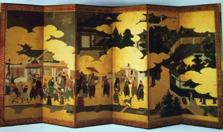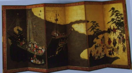 桃山時代の狩野派の傑作と言われている金屏風が2対、左は黒い南蛮船が長崎に着いたところで、忙しそうに荷降をしている船員、船上では上官が居心地のよさそうな椅子に座って商談をしている上官、陸上では陸揚げされた品々がチェックされている様子などがかかれている。左は、もの珍しそうな見物人の前を進むエキゾチックな人や物の行列が描かれている。日本人とヨーロッパ人の交流がこうして恐る恐る始まったのかと思うと感慨深い。