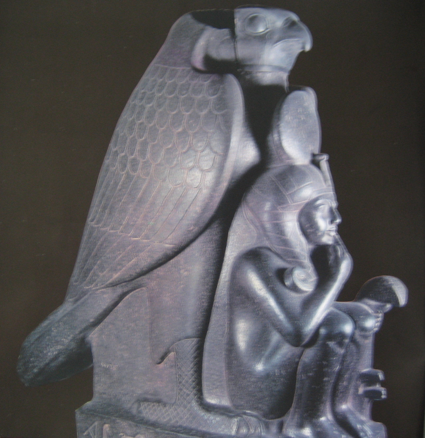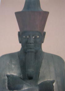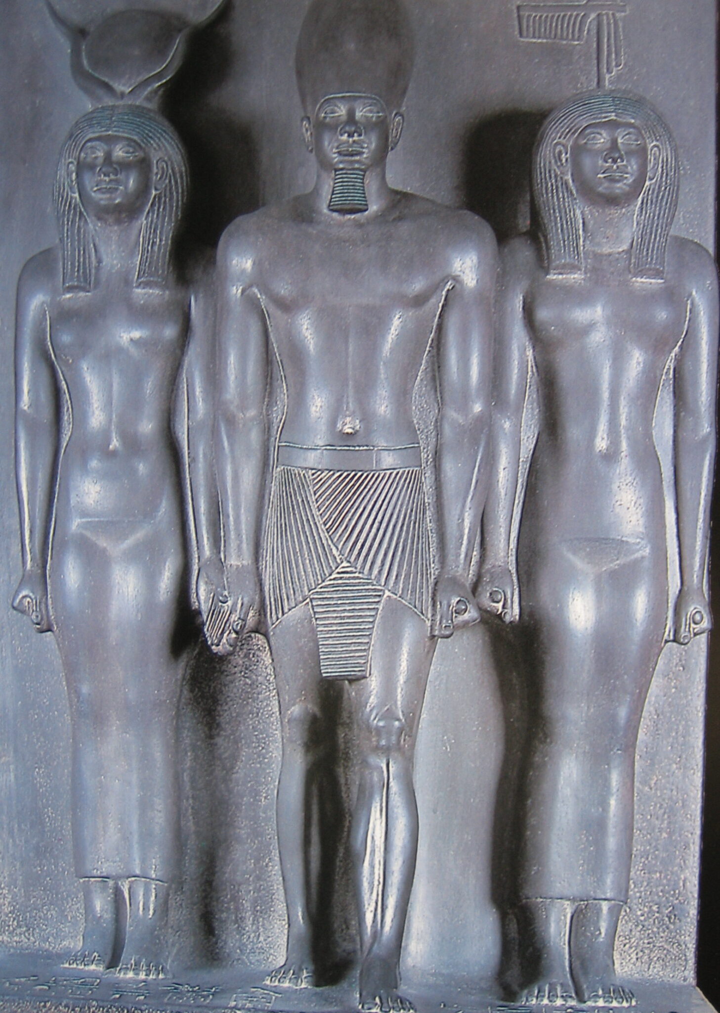 次に47号通路でのメンカウラー王の3柱神を見る、片岩製で上エジプトの白冠をかぶった王が真ん中で右に頭上に牡牛の角に挟まれた太陽円盤を頂く女神、左には上エジプトのアビドスを擬した女神を従えている。