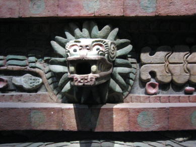 ケツアルコアトルはジャガーと蛇ととりが一体になっている。ジャガーの鼻と牙を持ち羽毛が生えているケツアルコアトルは水の神であり、蛇行しているような模様はへびの胴体で、たくさんの雨が降ってできた川をへびに見立てて表現しているそうだ。