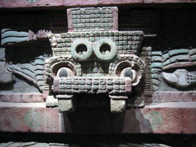 隣のがらくたを集めたような奇妙な顔をしているのが、雨の神であり豊穣の神様でもあるトラロックである。テオティワカンではトラロックが主神であった。