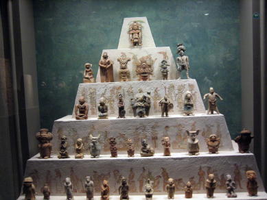 巨大な頭飾りを付け玉座に座る貴族像、頭蓋変形をしている戦士像、演説者といわれる生き生きとした像、大きな帽子(?)を被りマヤブルーのマント着ている貴族像などはより現実に近い描写になっている。またミニチュア人物像のコレクションはユーモラスである。